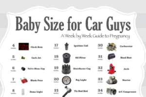 To help dads engage more with pregnancy and birth, a guide to baby size infographic for dads. It compares the size of a growing baby to various car parts!