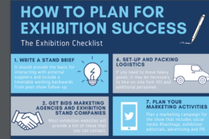 An infographic showing the key stages to consider when planning for an exhibition frokm the initial stand design brief to agency selection, exhibition manual forms, hotels and travel arrangements, logistics, marketing activities, marketing collateral and…